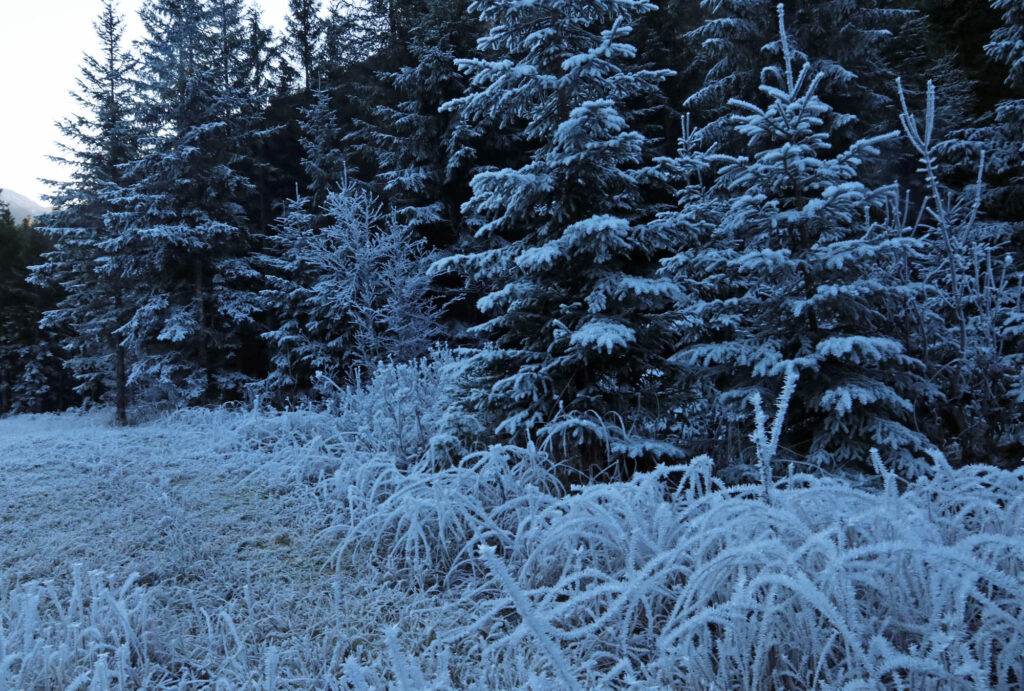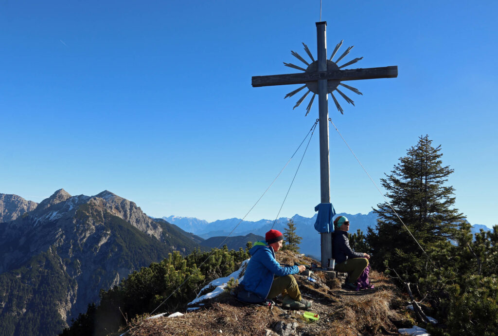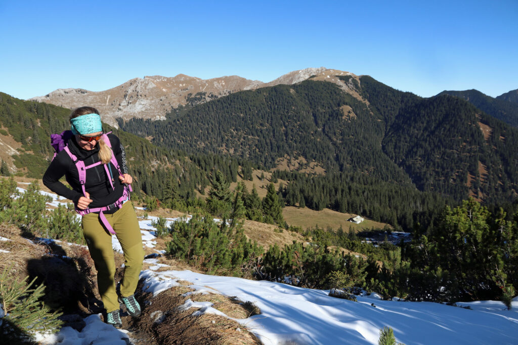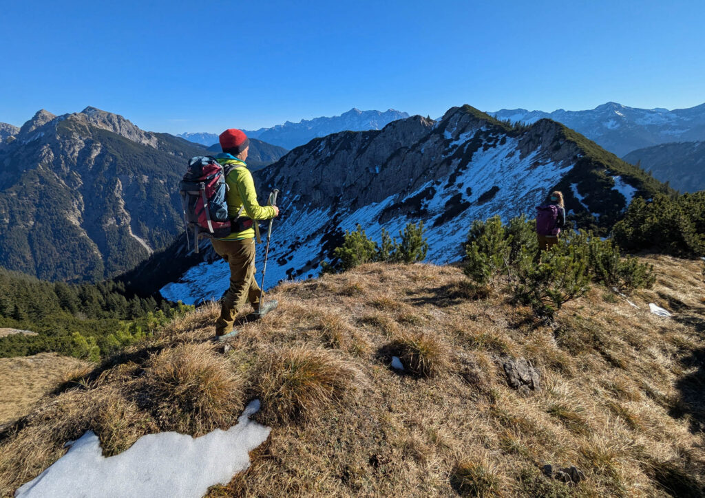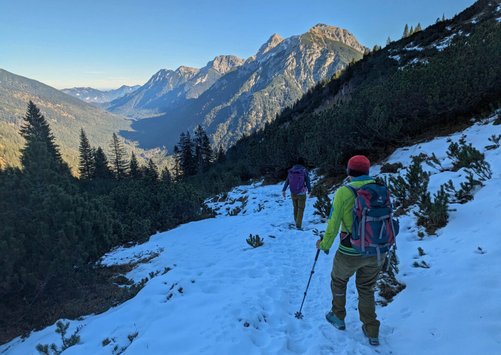Der schattige, kalte Ammerwald – der gestern von filigranen Raureifnadeln verzaubert war – ist Ausgangspunkt einer herrliche Rundtour, die den Ochsenälpeleskopf mit dem Kreuzkopf verbindet. Die schönste Etappe ist die Kammüberschreitung von Gipfel zu Gipfel, bei der am Anstieg zum Kreuzkopf auch mal die Hände mit zupacken. Zudem braucht man für die weglosen Passagen Orientierungsvermögen. Vor allem dann, wenn wie gestern nordseitig bereits Schnee liegt. Die teils geschlossenen Schneedecke im Kuhkar und im Kalbelekar war übrigens bereits so fest, dass man nicht einsank. Zudem war der Schnee recht griffig.