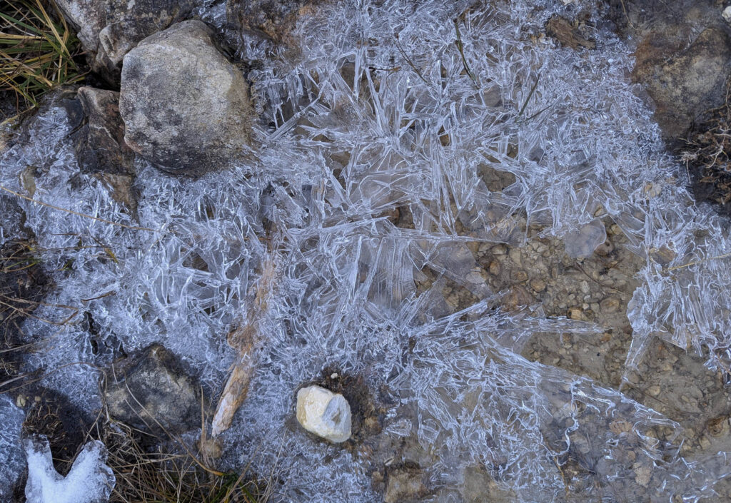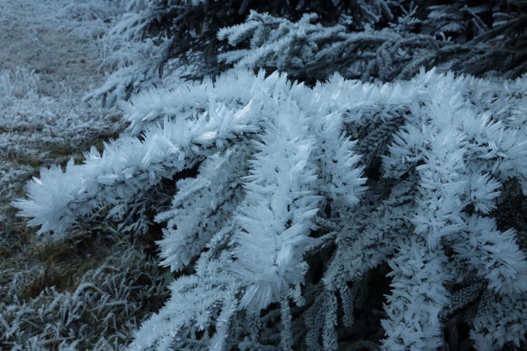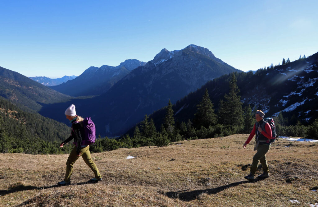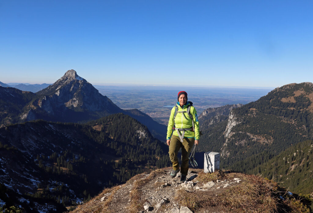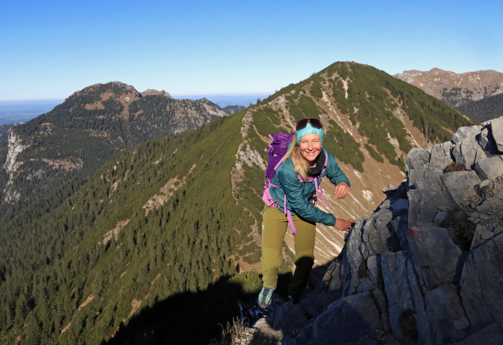 Der schattige, kalte Ammerwald – der gestern von filigranen Raureifnadeln verzaubert war – ist Ausgangspunkt einer herrliche Rundtour, die den Ochsenälpeleskopf mit dem Kreuzkopf verbindet. Die schönste Etappe ist die Kammüberschreitung von Gipfel zu Gipfel, bei der am Anstieg zum Kreuzkopf auch mal die Hände mit zupacken. Zudem braucht man für die weglosen Passagen Orientierungsvermögen. Vor allem dann, wenn wie gestern nordseitig bereits Schnee liegt. Die teils geschlossenen Schneedecke im Kuhkar und im Kalbelekar war übrigens bereits so fest, dass man nicht einsank. Zudem war der Schnee recht griffig.