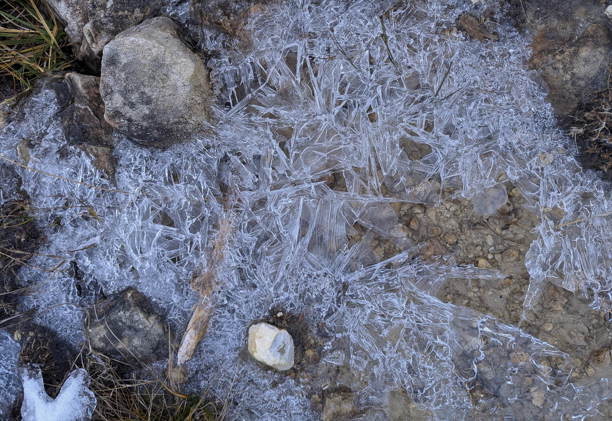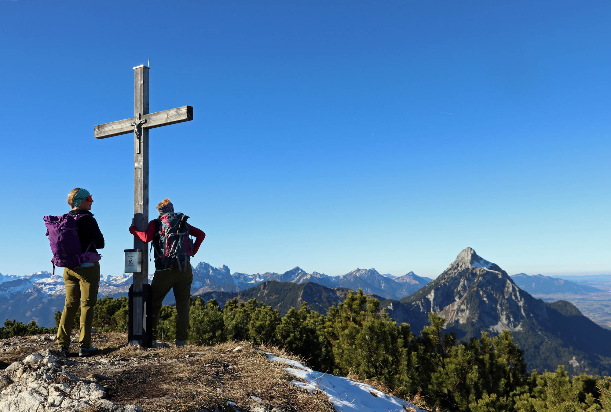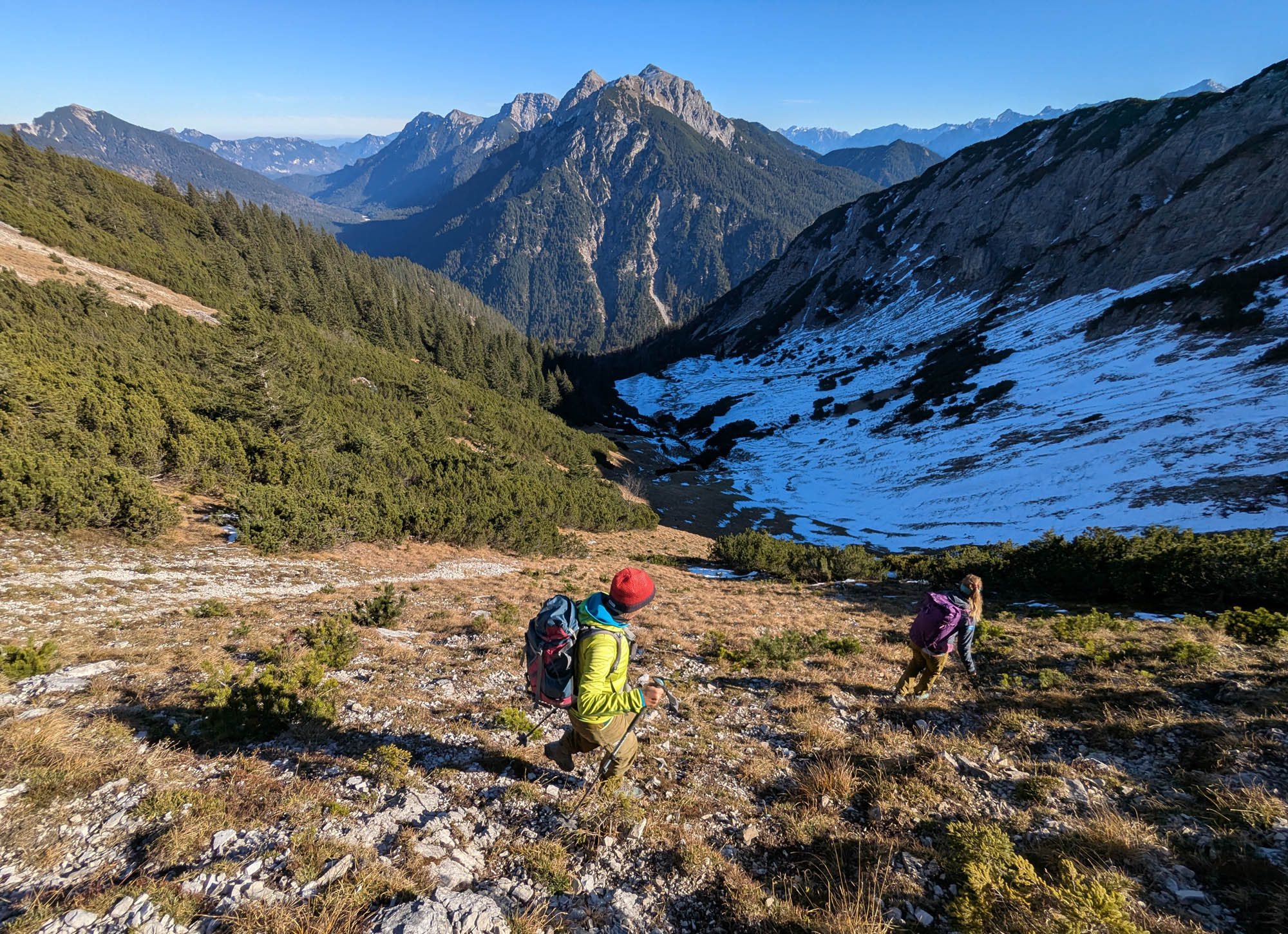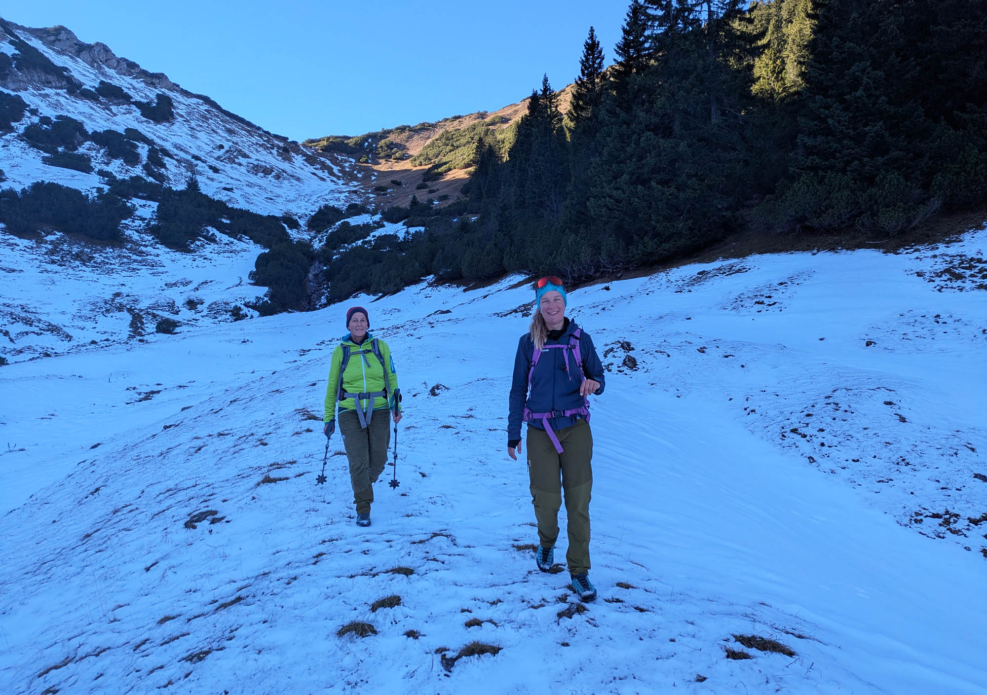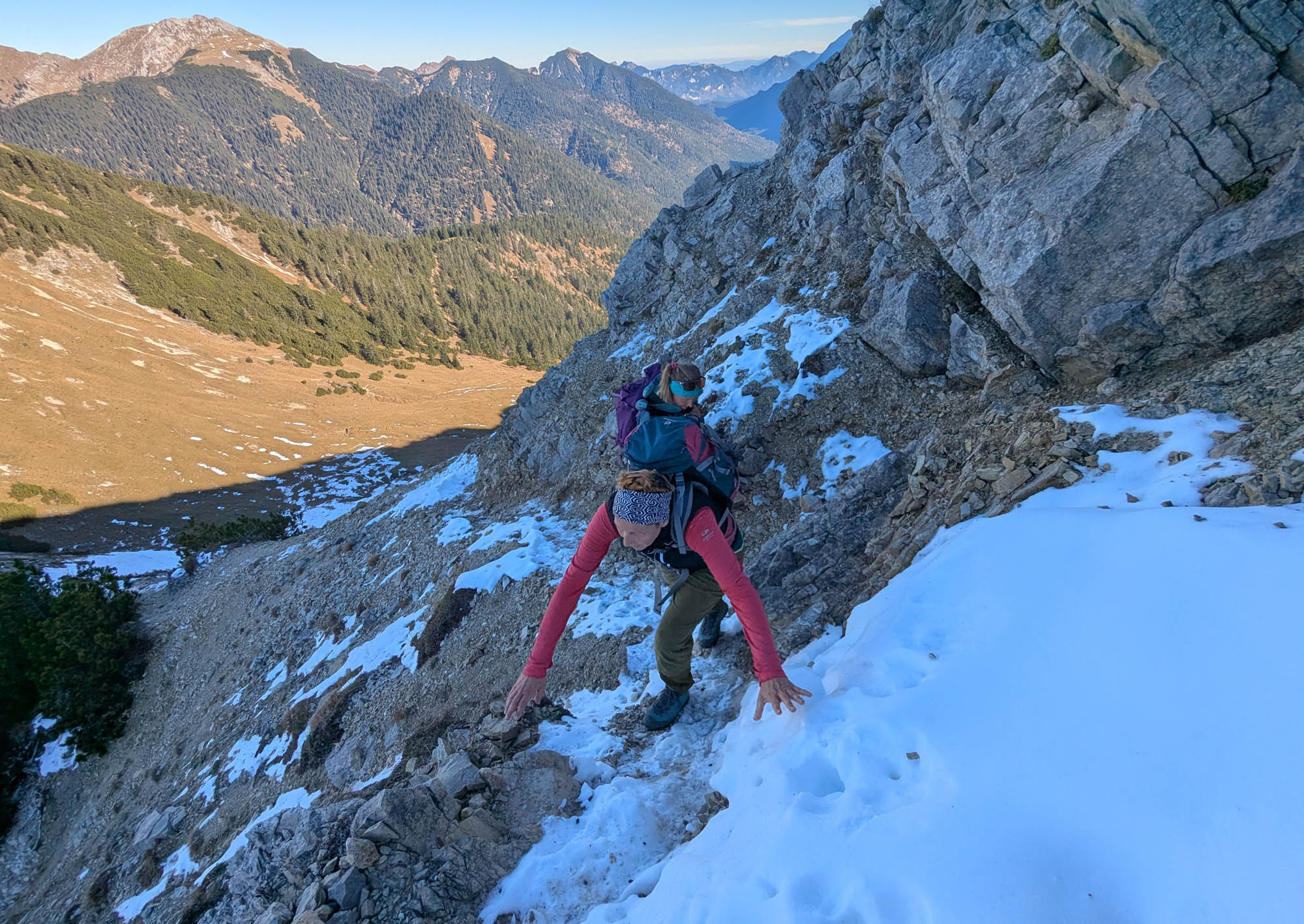 Der schattige, kalte Ammerwald – der gestern von filigranen Raureifnadeln verzaubert war – ist Ausgangspunkt einer herrliche Rundtour, die den Ochsenälpeleskopf mit dem Kreuzkopf verbindet. Die schönste Etappe ist die Kammüberschreitung von Gipfel zu Gipfel, bei der am Anstieg zum Kreuzkopf auch mal die Hände mit zupacken. Zudem braucht man für die weglosen Passagen Orientierungsvermögen. Vor allem dann, wenn wie gestern nordseitig bereits Schnee liegt. Die teils geschlossenen Schneedecke im Kuhkar und im Kalbelekar war übrigens bereits so fest, dass man nicht einsank. Zudem war der Schnee recht griffig.