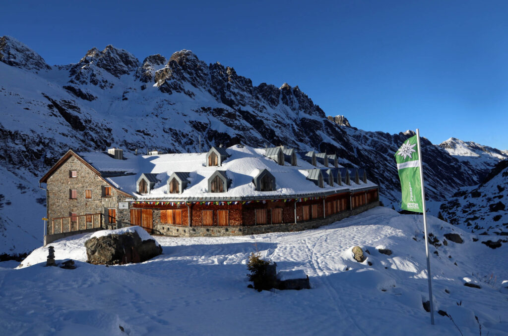 Fazit: Wie so gut wie überall ist die Schneelage auch in der Silvretta leider unzureichend. Vor allem das Felsblockgelände braucht noch einen guten halben Meter Neuschnee. Insgesamt liegt in nordseitigen Mulden am meisten Schnee. Südseitige Hänge sind nicht möglich. Alles in allem aber drei tolle Tage. Vor allem, weil am Gipfel der Hinteren Jamspitze ein junger Bartgeier über unseren Köpfen kreiste. Let´s pray for snow! Und vielen Dank an die Sektion Schwaben für den schönen Winterraum.