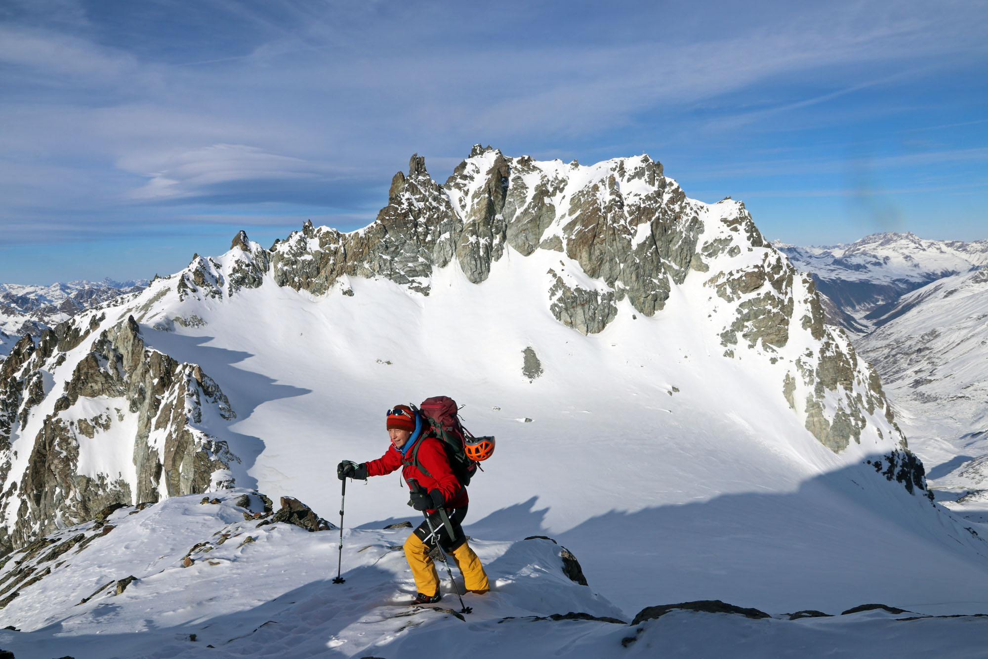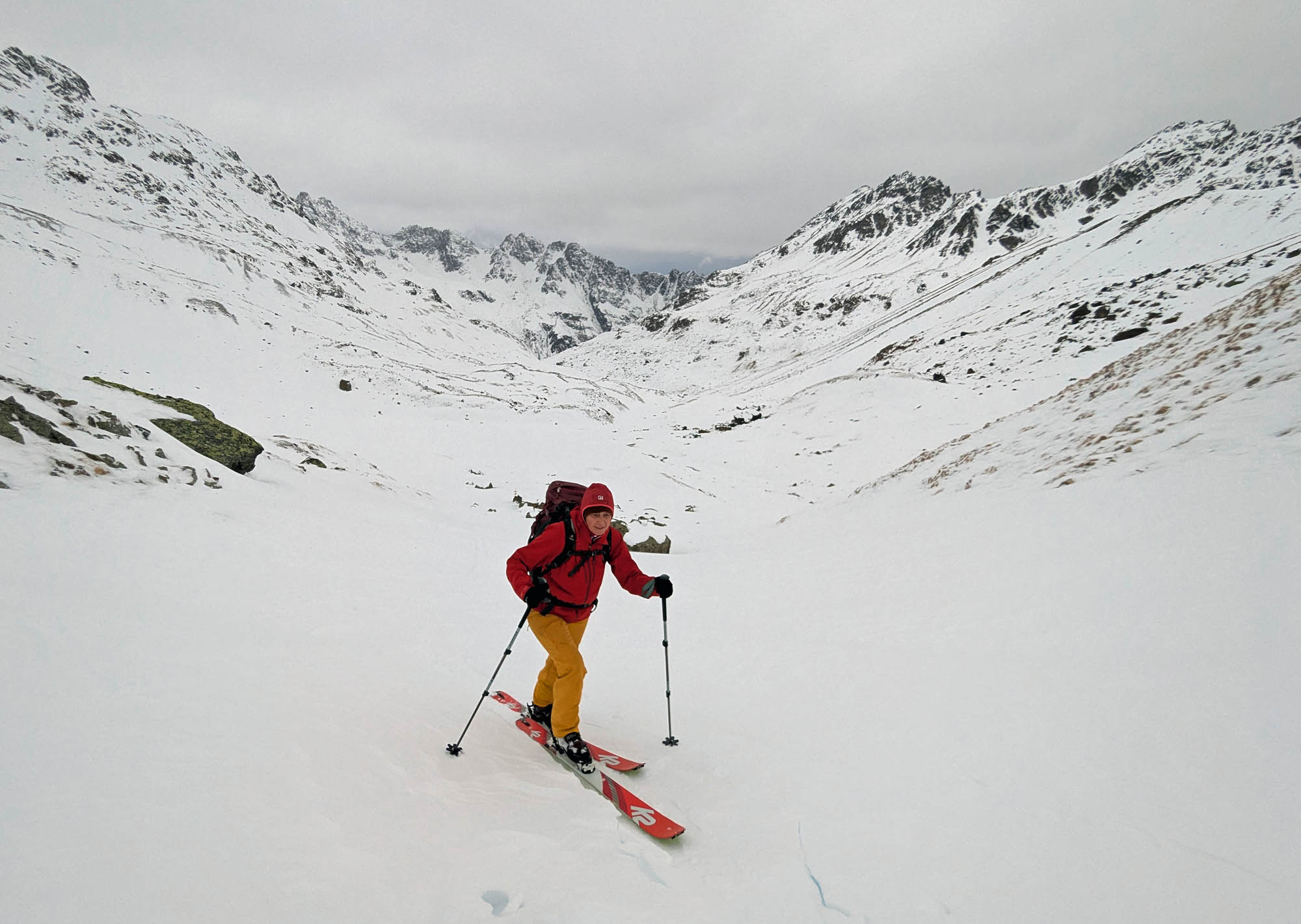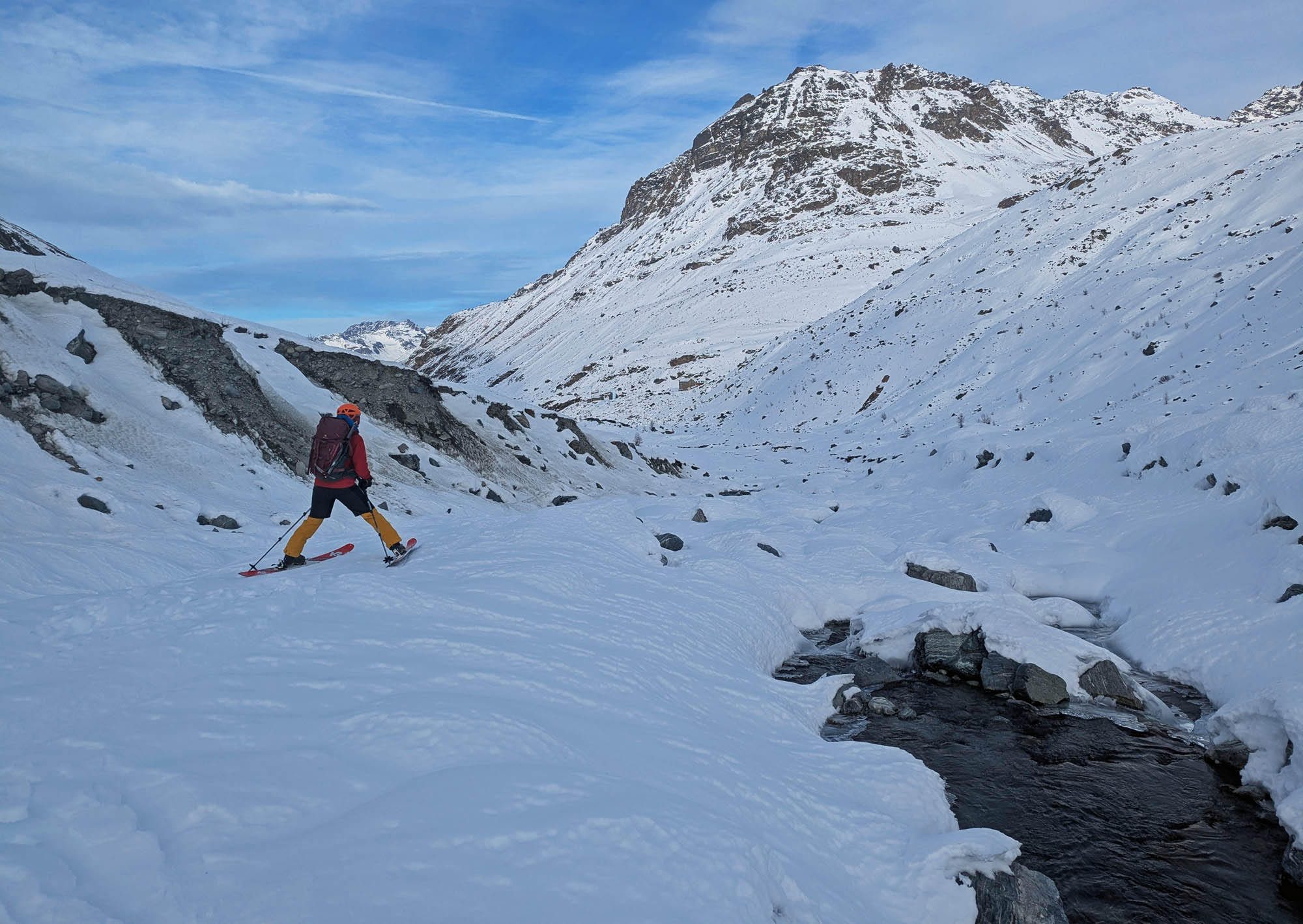 Kronenjoch: Im Futschölbach Tal ist das Felsblockgelände noch unzureichend eingeschneit. Aber mit Vorsicht kann man fast ohne Steinkontakt anfahren. Bis 2500 m hat es unangenehmen Brucharsch, der durch die Regenfälle von vor einer Woche entstanden ist. Oberhalb davon ist die Schneequalität besser, aber teils auch vom Wind geprägt. Die Gipfelhänge und –rücken von Bischofspitze, Grenzeck Kopf und Breiter Krone sind abgeblasen.