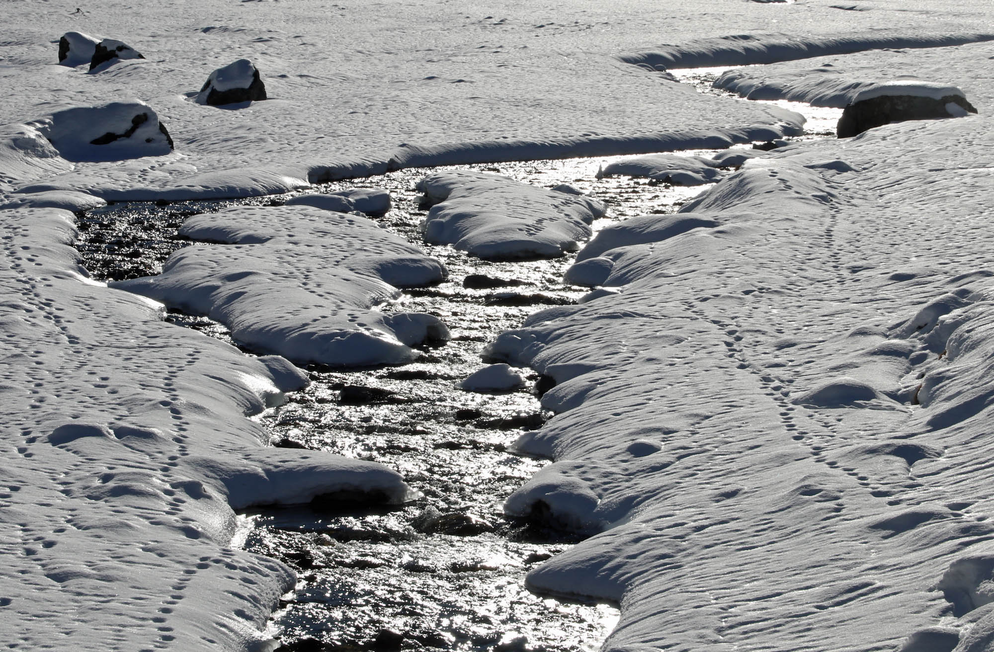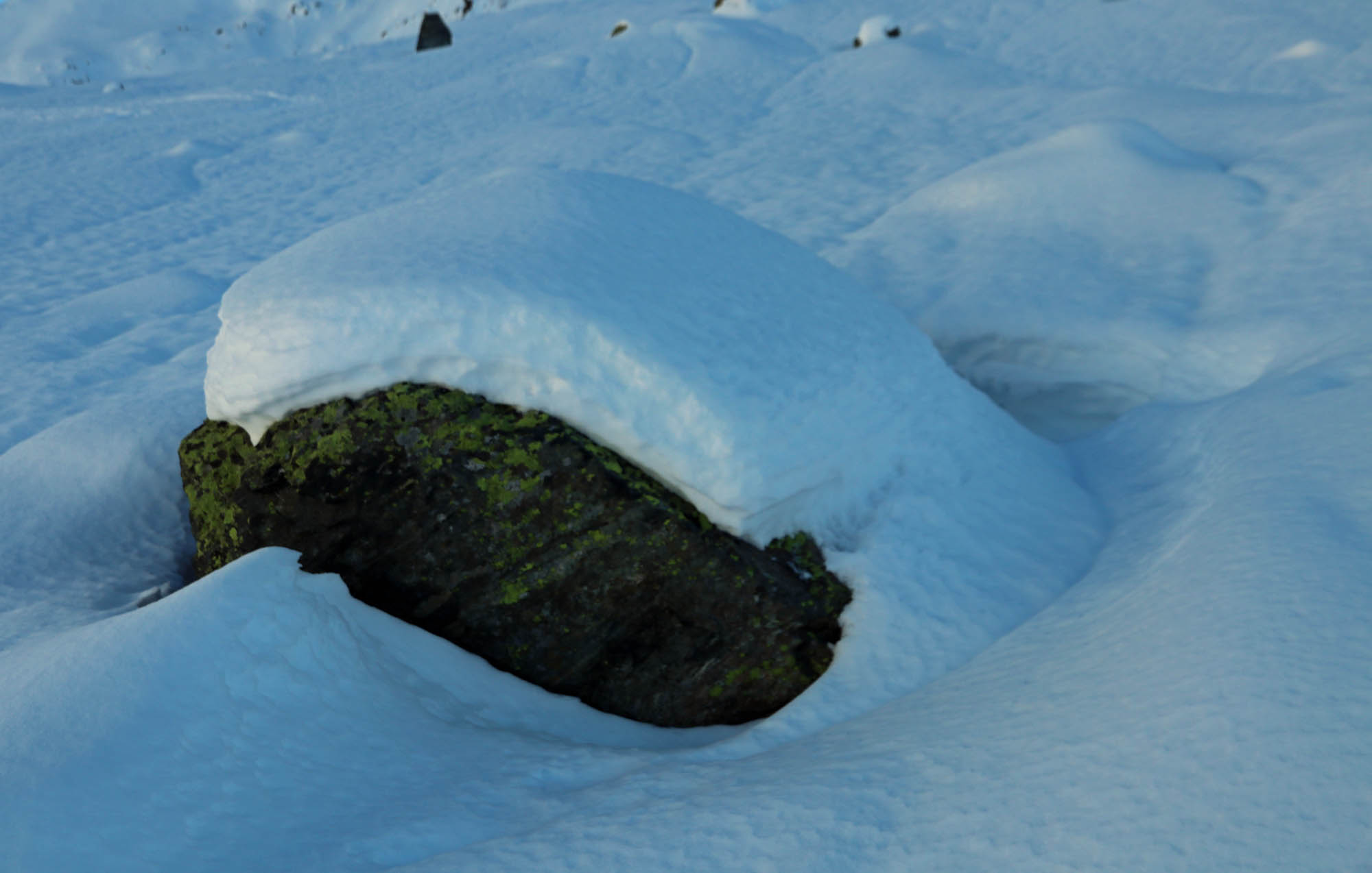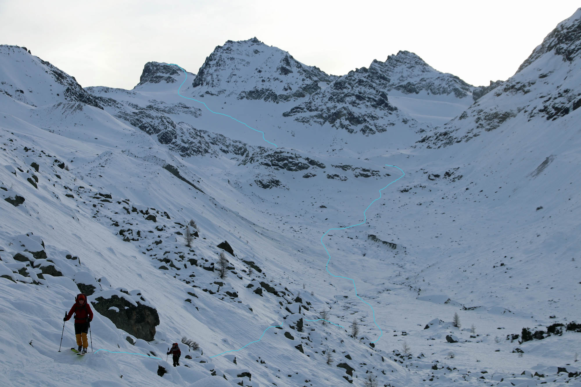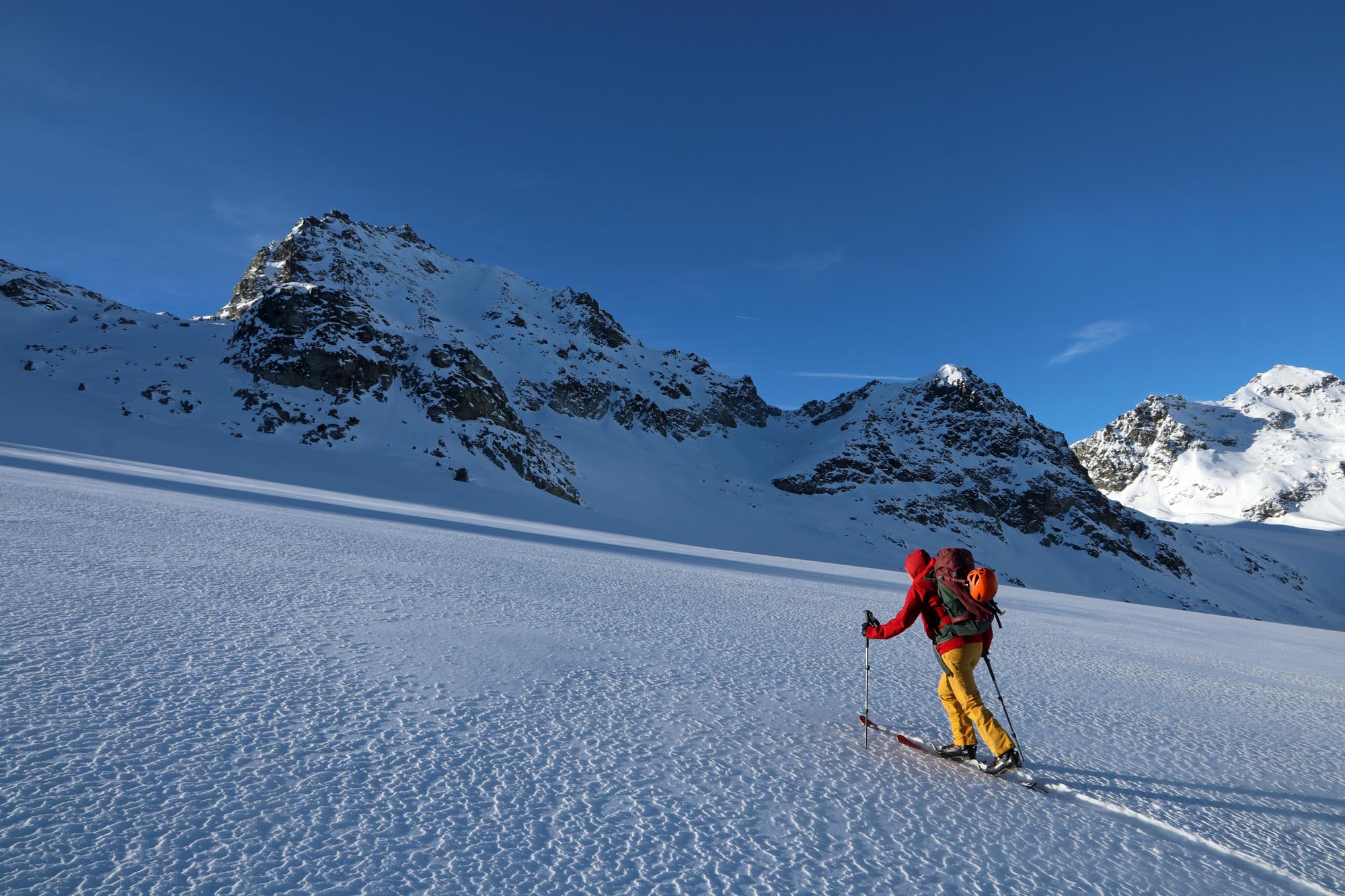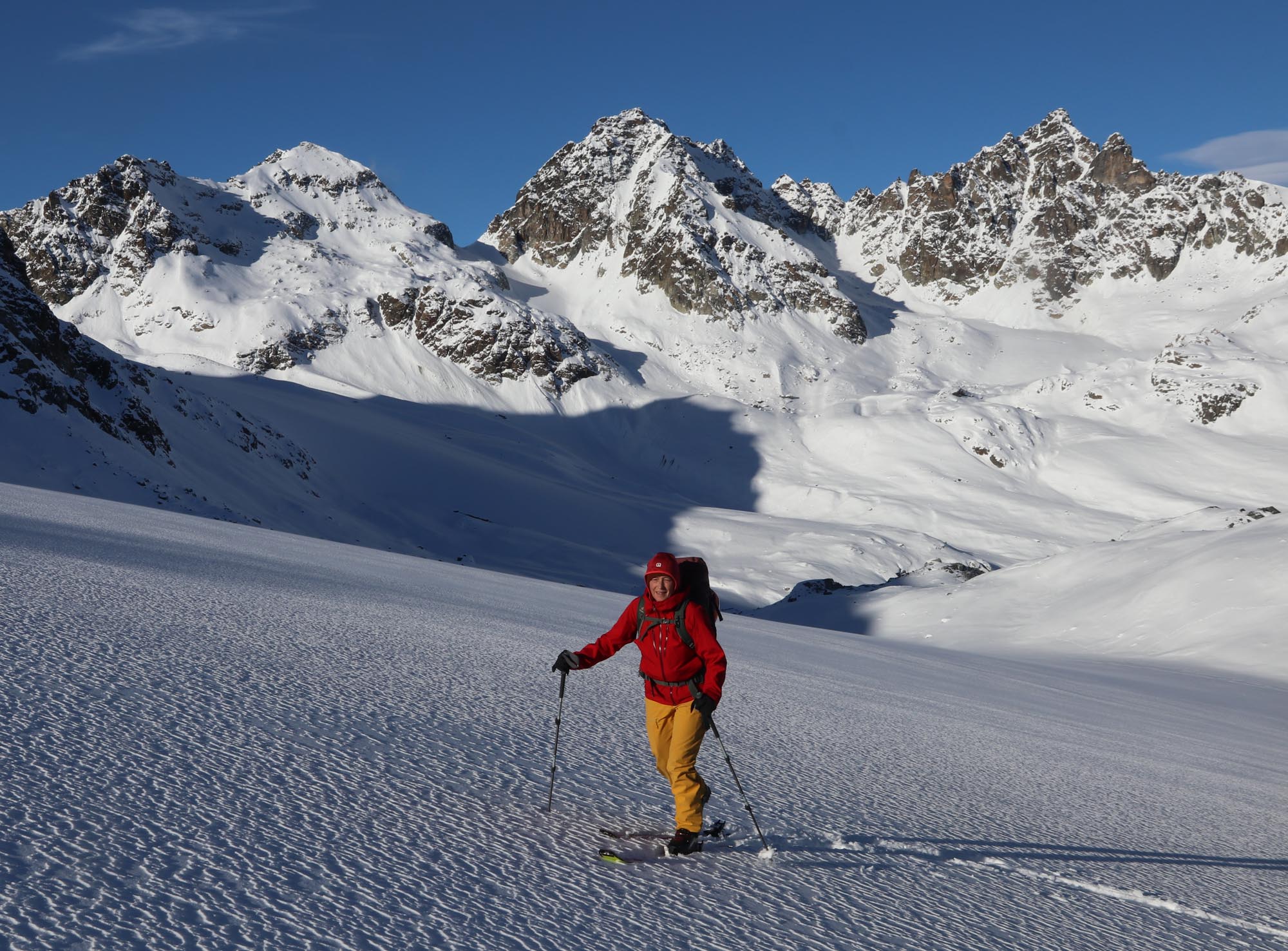 Fazit: Wie so gut wie überall ist die Schneelage auch in der Silvretta leider unzureichend. Vor allem das Felsblockgelände braucht noch einen guten halben Meter Neuschnee. Insgesamt liegt in nordseitigen Mulden am meisten Schnee. Südseitige Hänge sind nicht möglich. Alles in allem aber drei tolle Tage. Vor allem, weil am Gipfel der Hinteren Jamspitze ein junger Bartgeier über unseren Köpfen kreiste. Let´s pray for snow! Und vielen Dank an die Sektion Schwaben für den schönen Winterraum.