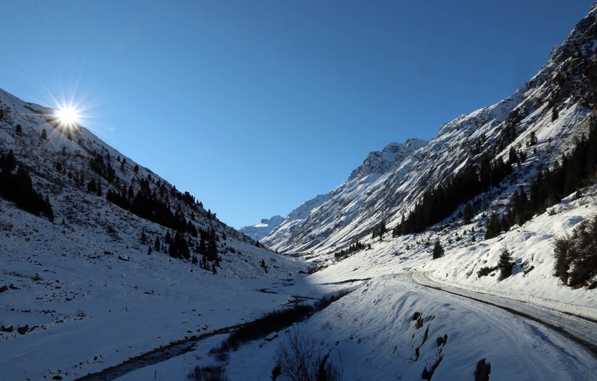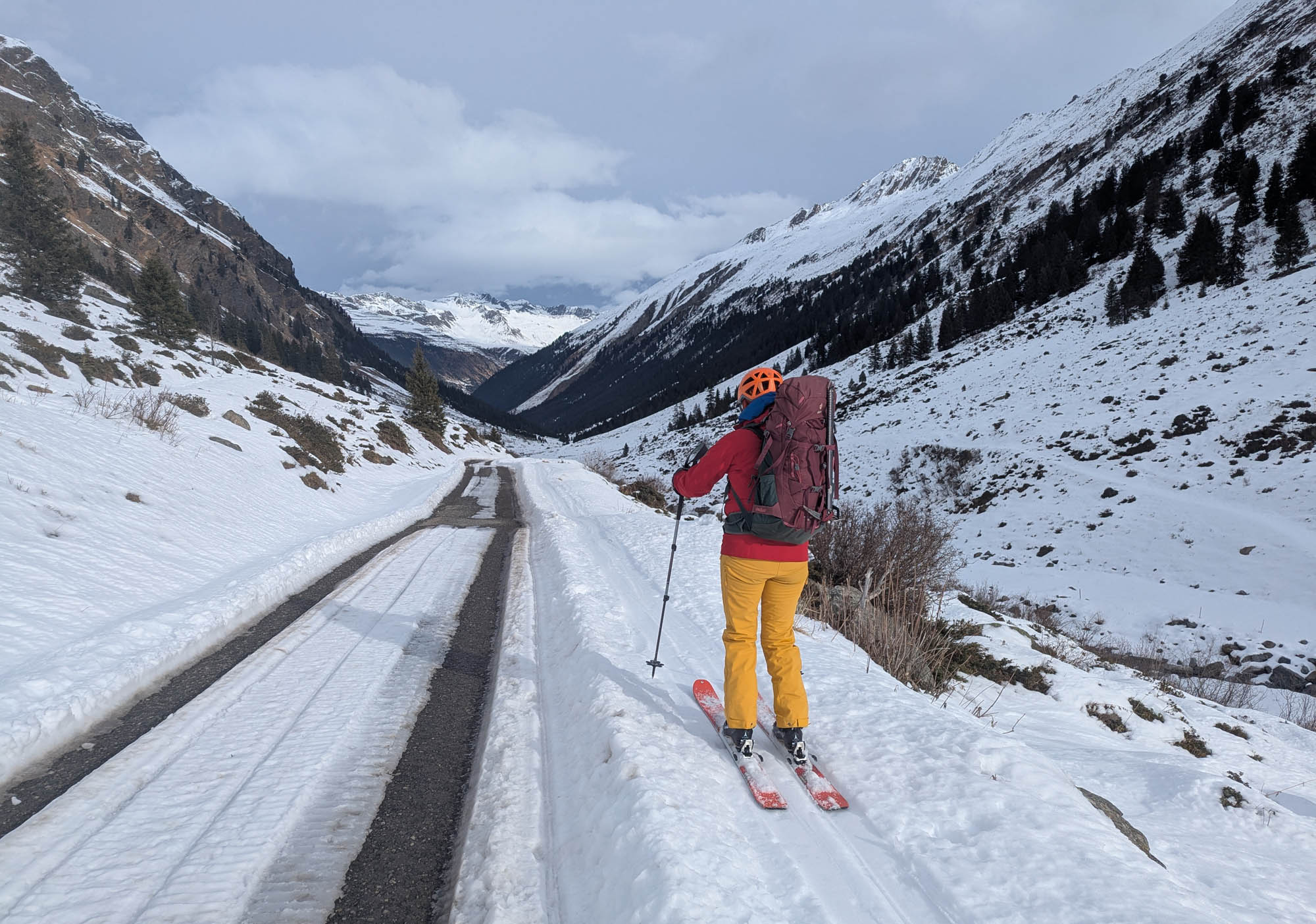 Hüttenzustieg: Von Galtür ab ausreichend Schnee. Bis zur Scheibenbalm hat die Fahrstraße apere Stellen, aber daneben liegt noch genug Schnee zum Aufsteigen und Abfahrten. Ab der Alpe auch genug Schnee auf der Straße, der durch Skidoo hart verfestigt ist.