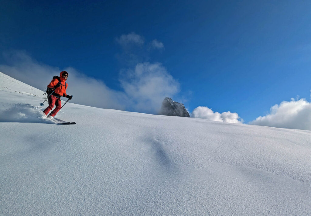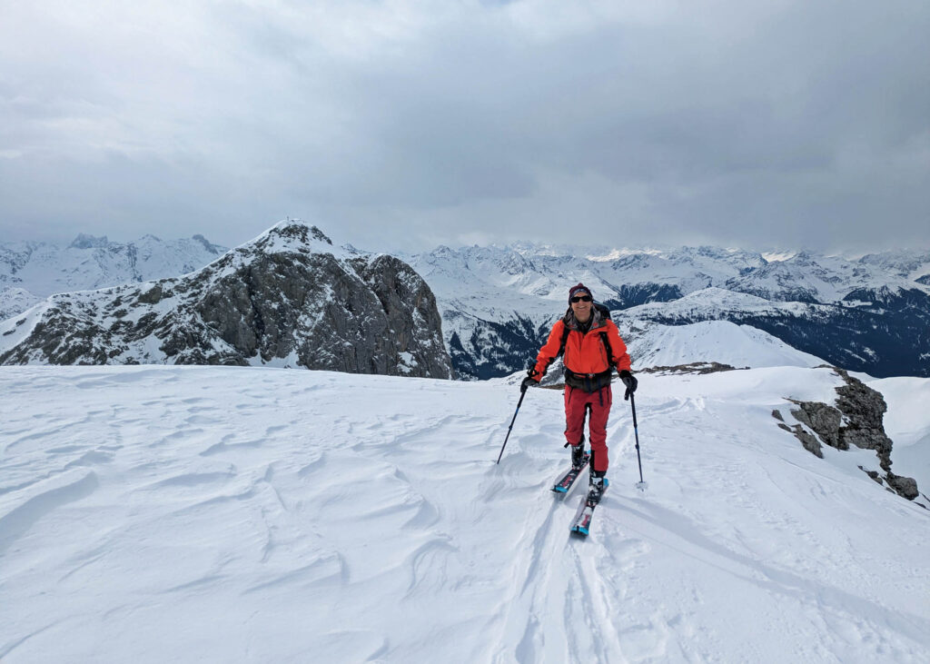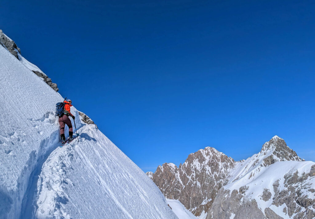 Krönender Abschluss war an Tag 3 die Überschreitung des Mehlsack. Auf dem auch nicht gerade flachen und harten Riesenhang östlich des Stierloch Jochs war ich um meine Harscheisen ziemlich froh. Respekt Maria, dass du das unten ohne gemeistert hast 🙂