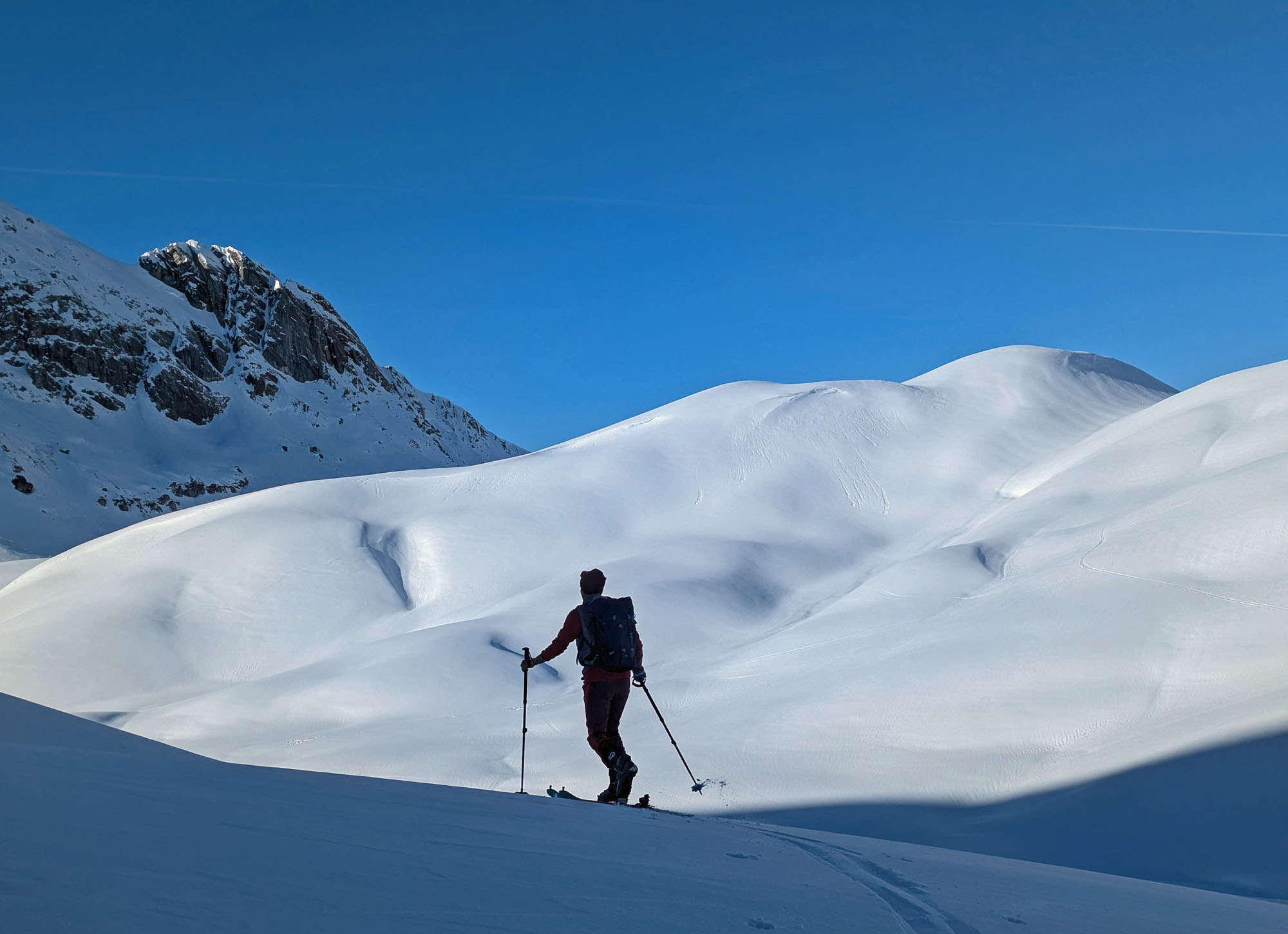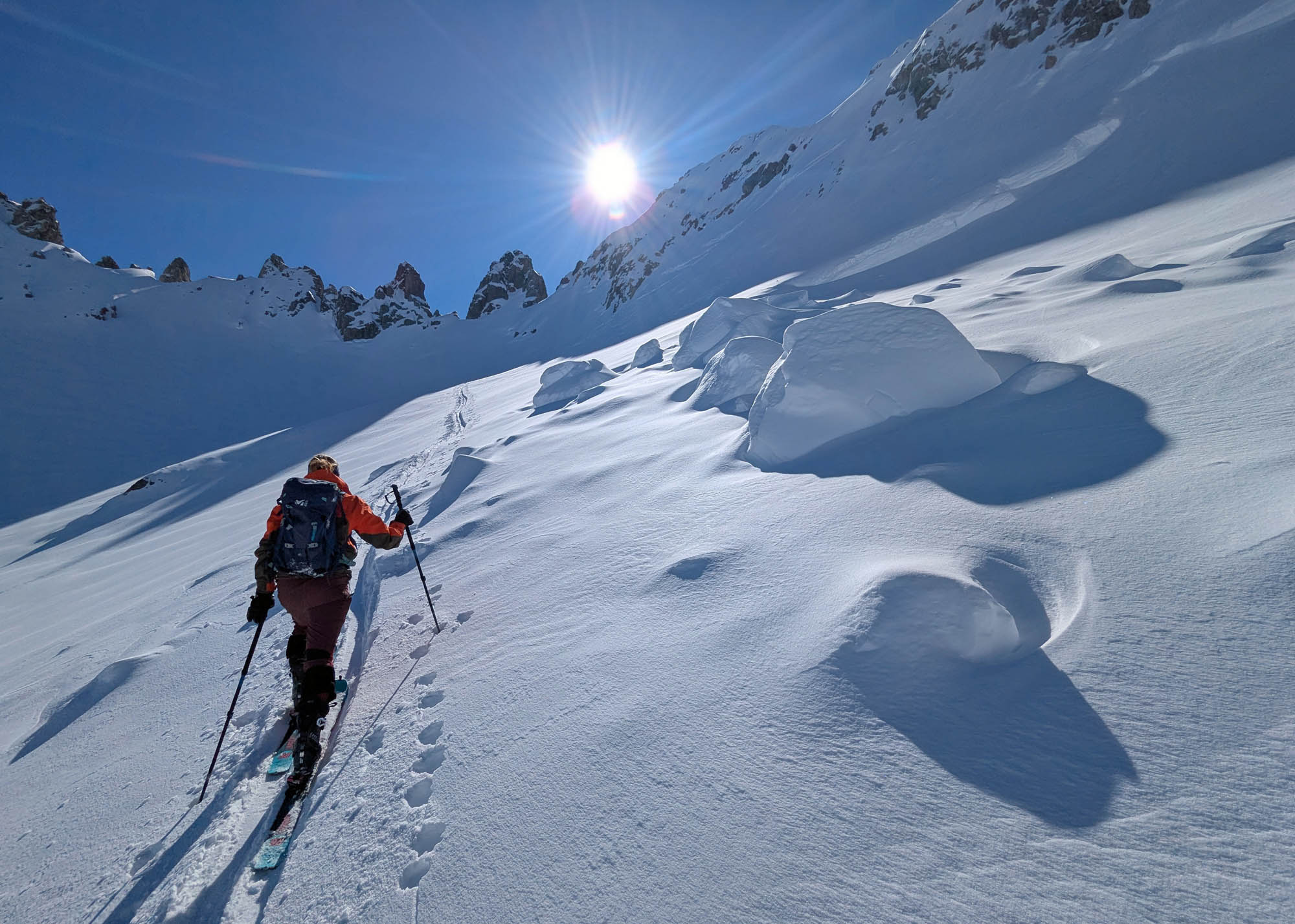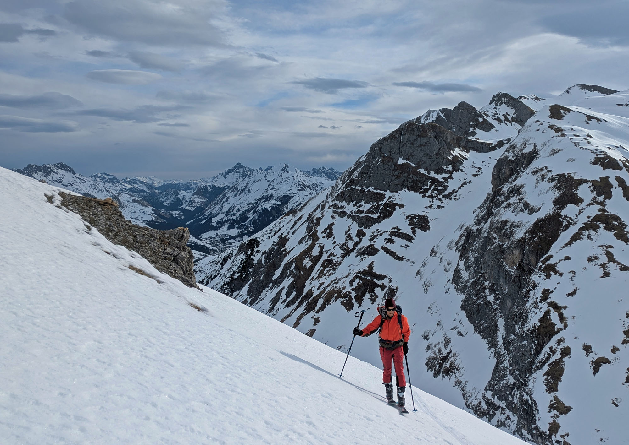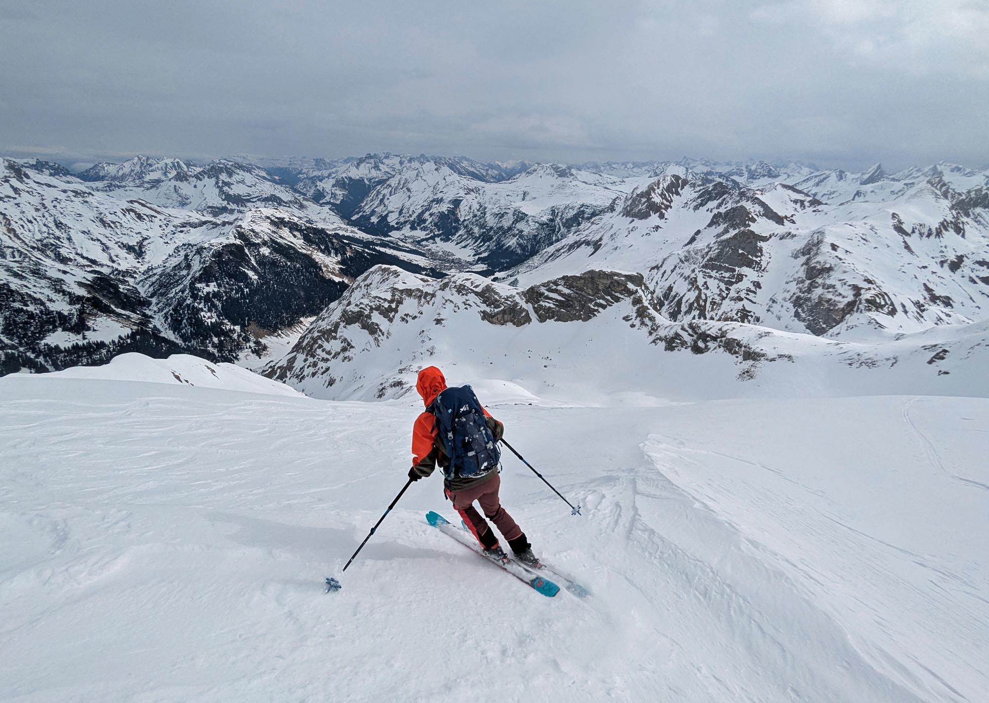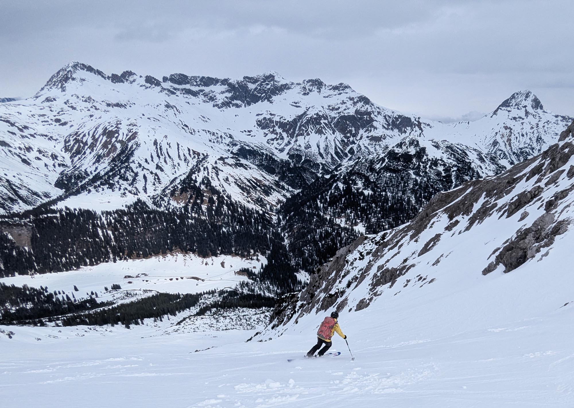 Krönender Abschluss war an Tag 3 die Überschreitung des Mehlsack. Auf dem auch nicht gerade flachen und harten Riesenhang östlich des Stierloch Jochs war ich um meine Harscheisen ziemlich froh. Respekt Maria, dass du das unten ohne gemeistert hast 🙂