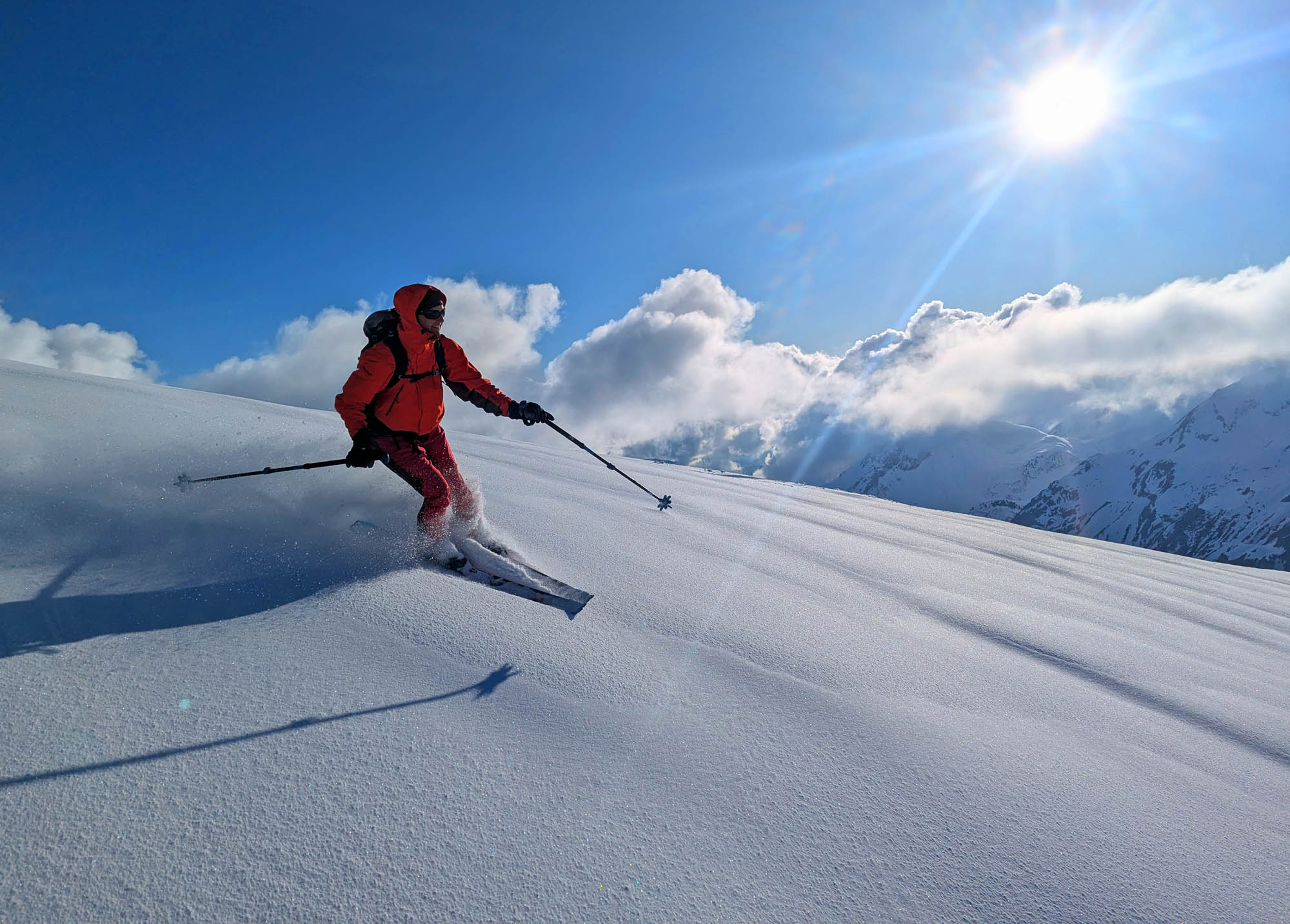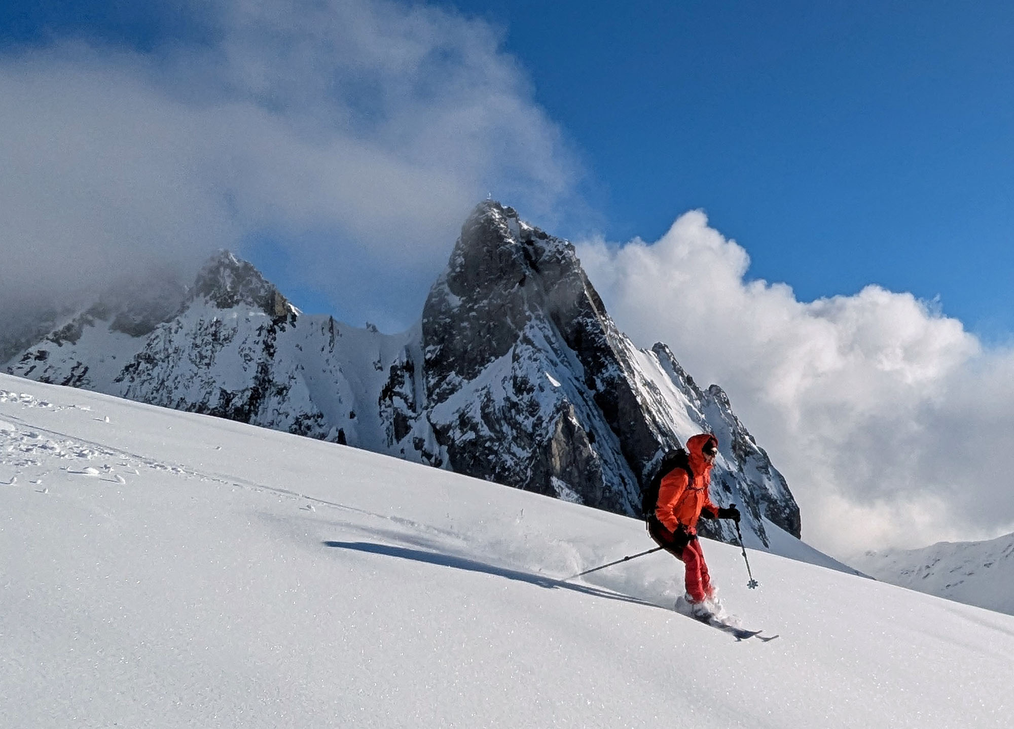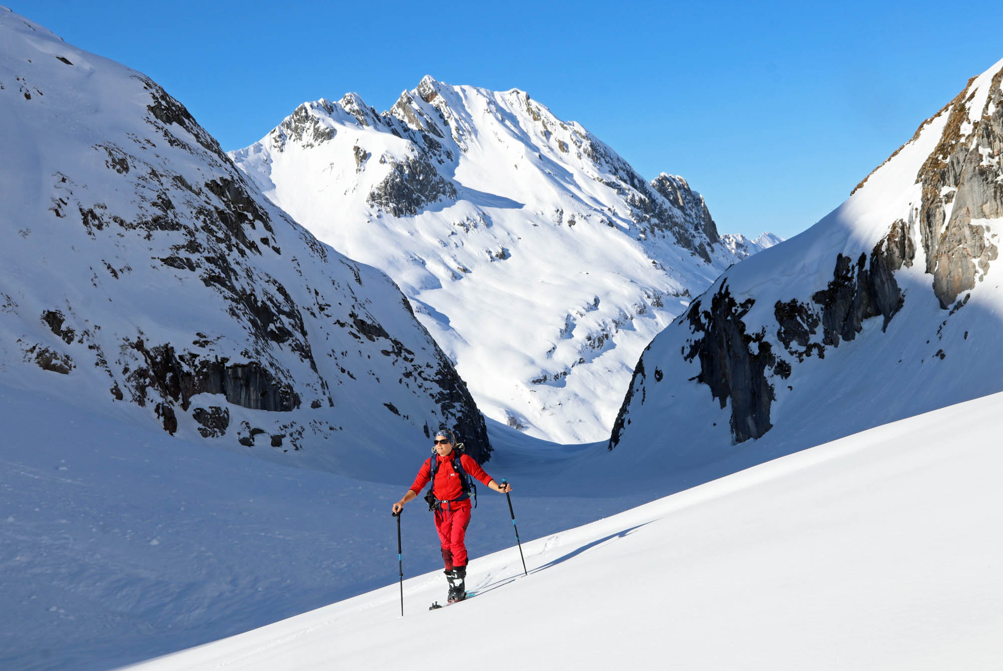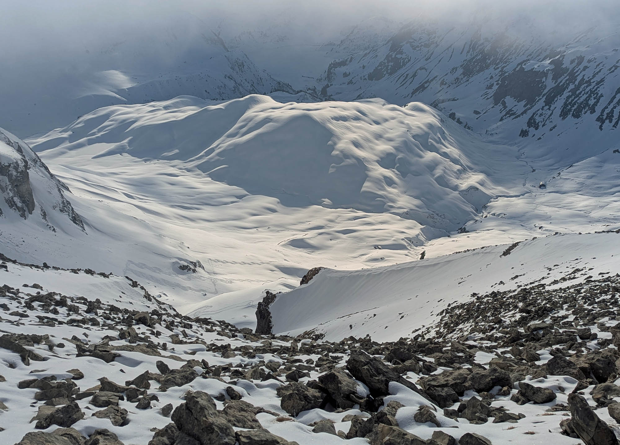 Nach dem Gipfelglück ging es durch das grandiose Schneetal zurück nach Zug, das wir rechtzeitig erreichten, bevor der Föhn zusammenbrach und dichter Nebel bis in den Talboden drückte.