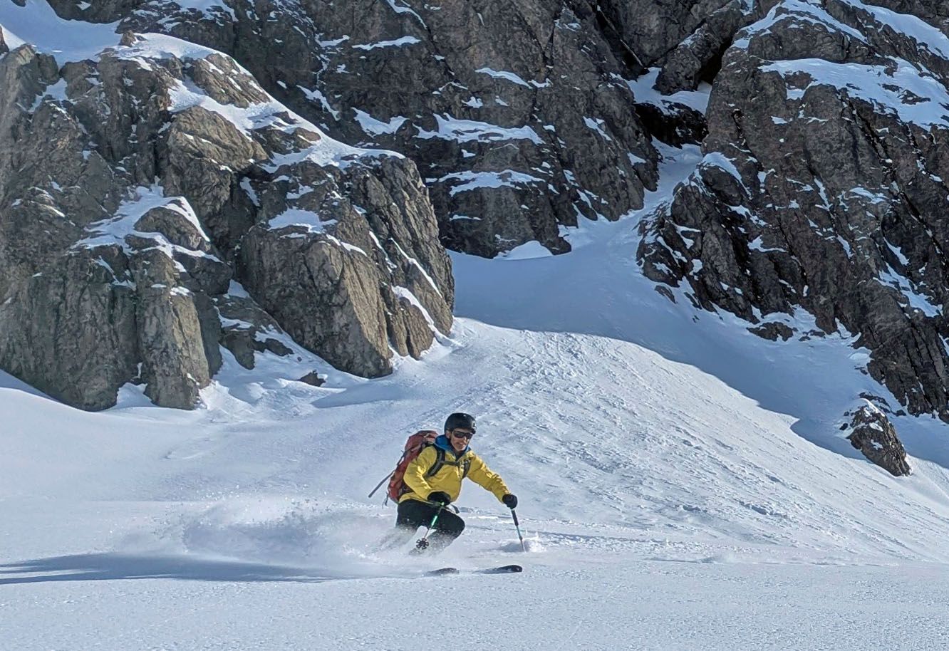 Auf dem Zustieg von Zug bietet es sich am ersten Tag an, die Obere Wildgrubenspitze zu besteigen, die noch ziemlich nah am Skigebiet liegt, deren Gipfel aber von den Variantenfahrern kaum bestiegen wird. Der Gipfelhang ist recht verblasen, aber man findet auf der Leeseite Schnee zum runterfahren. Das Stahlseil am Gipfelanstieg ist fast schneefrei. Wir wurden oben mit herrlichem Powder und weiter unten mit perfekten Firn belohnt.